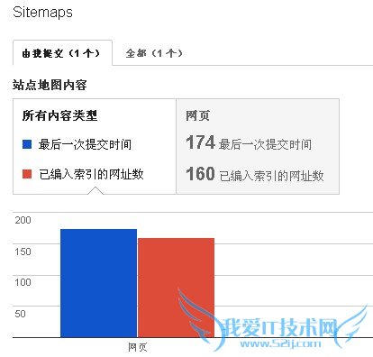 等了大概一个星期,百度慢慢的开始收录页面了,但是GOOGLE还是没动静,登陆GOOGLE网站管理员工具找原因,结果发现sitemap提交正 常,没有错误,而且显示提交网址数174,已编入索引的网址数居然有160了,但是site:查不到记录,检查网站页面状态 也都是正常的。