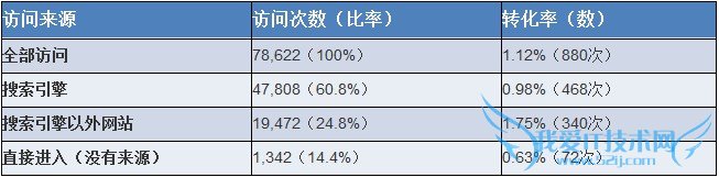 从上表我们可以看出【搜索引擎】方式进入的访问次数占总体的60%以上。转化率虽然比平均值低,但转化数却占转化总数的一半以上,由此可以得知该网站主要依存于搜索引擎的进入。上表我们还可以得知【搜索引擎以外的来源】进入的转化率很高。