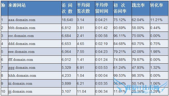 我们再看一下其他访问来源的分析数据。第5位和第7位的【eee.domain.com】和【ggg.domain.com】相比其他访问来源网站内的停留时间较长,跳出率也在50%以下,转化率超过了1%,是两个不错的来源页,可以考虑是不是能从它们引入更多的流量。但访问次数排名第3位和第6位的【ccc.domain.com】 和【fff.domain.com】的跳出率都在75%以上,转化率甚至为0.00%。通过比较访问来源网站的说明和进入页的内容介绍后,可以推断是由于内容不合所造成,看来对内容的对应调整是必不可少了。