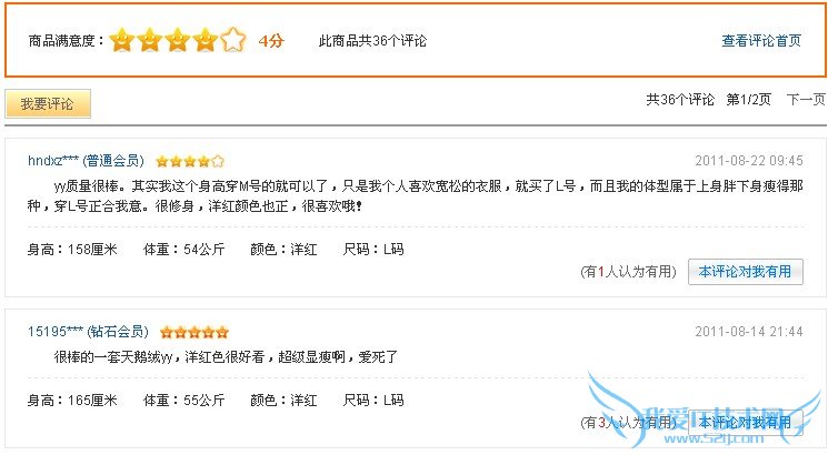 麦考林作为重点做女装的网商,在每条评论后都列出评论者的身高、体重、选择的颜色和尺码,这些信息给之后想购买的用户很大的参考价值。