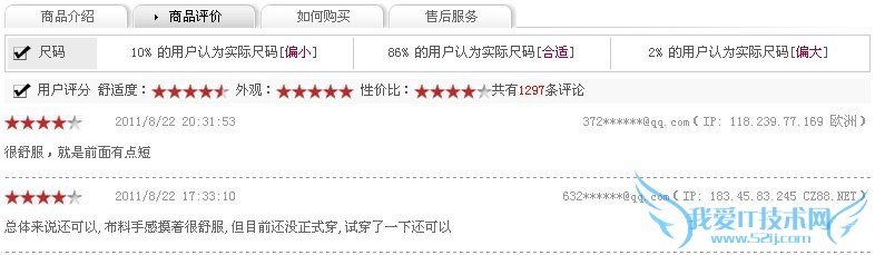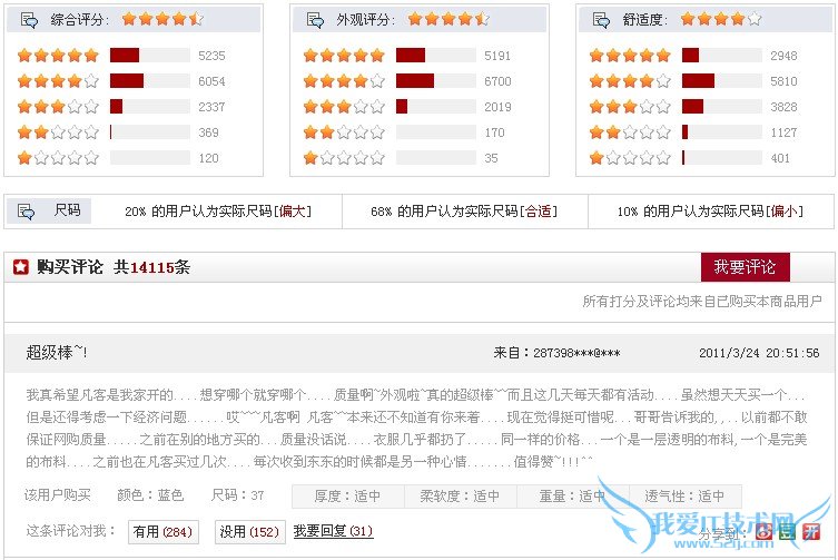 最典型的例子就是凡客。将评分细分为外观评分和舒适度,每一项都有一个总体评分还把评分的分布也列了出来。在尺码方面,也有特别的强调,对于服装来说,不能试穿如何选到合适的尺码,这一点的强调也是很有价值的。