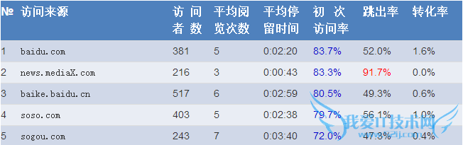 从上面的访问来源分析数据中可以看出,初次访问率排在前5的访问来源大多数是购买过关键字广告的网站,可见广告在吸引潜在客户方面的确很有效果,但是盲目的去购买广告也不是什么好事。比如初次访问率排名第2的访问来源(news.mediaX.com)跳出率高达91%,可以说这种情况下花在这个媒体网站上的广告费几乎都打了水漂。 所以在购买广告的时候,最好多些预算花费在那些跳出率相对较低的来源页面上。