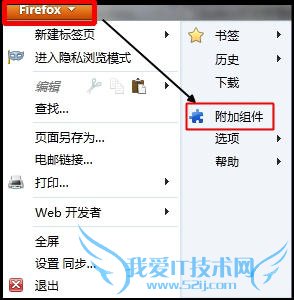 下载Firefox并安装,下载地址http://www.firefox.com.cn/ (此文示例的Firefox是12.0版本),打开Firefox,点击左上角菜单,点击“附加组件”,如下图: