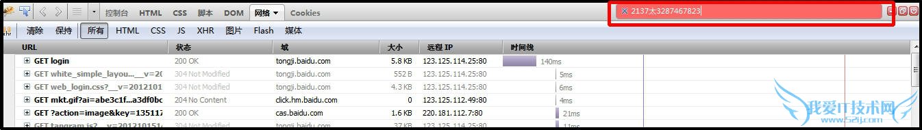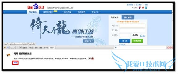 在Firefox中,打开 百度统计首页,按“F12”快捷键即可启动Firebug插件(再按即关闭),页面将弹出Firebug的工具栏,主要功能选项有“控制台、HTML、 CSS、脚本、DOM、网络”六个,选择其中的“网络”按钮,再点击下方用红线框标出的“启用”按钮,如下图: