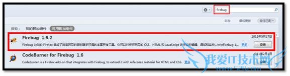 在出现的搜索栏中搜索firebug,选择下图红线框内工具,点击安装,重启浏览器即可完成安装过程(Firebug是Firefox下一款五星级的插件,集HTML查看和编辑、Javascript控制台、网络状况监视器于一体,有了它就有如神助)。
