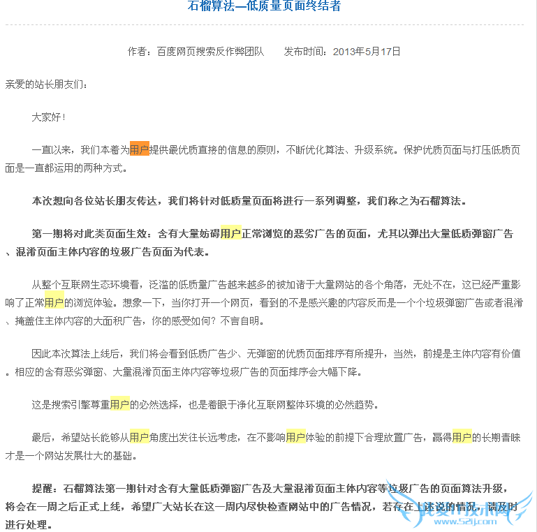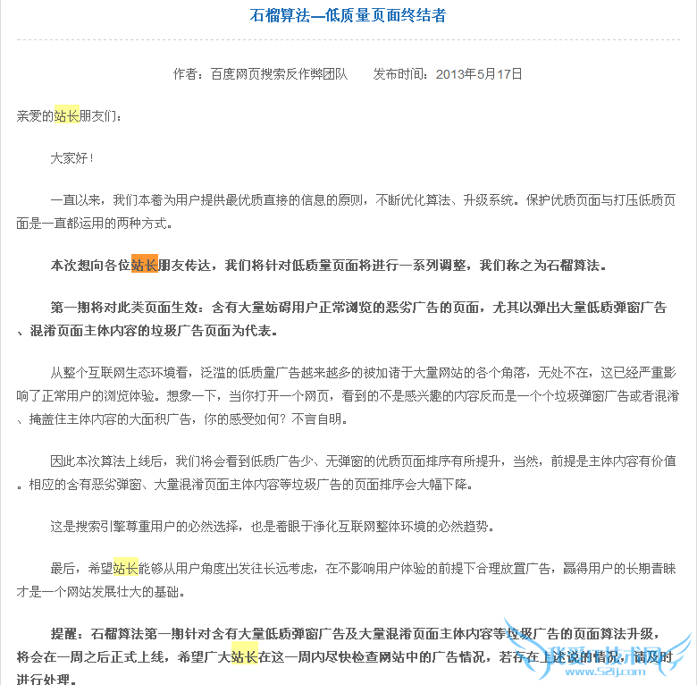 再看,“站长”,这篇文章起首就写了“亲爱的站长朋友们”,看来这篇文章的对象是对着所有互联网上的站长朋友说的。文中在向站长们传递一个信息,就是出台的“石榴算法”,进行解释,也给予一定的提醒。所以所有做站的朋友们,都得引起关注。这是百度再向我们发出挑战了。