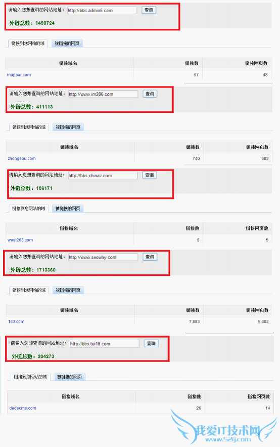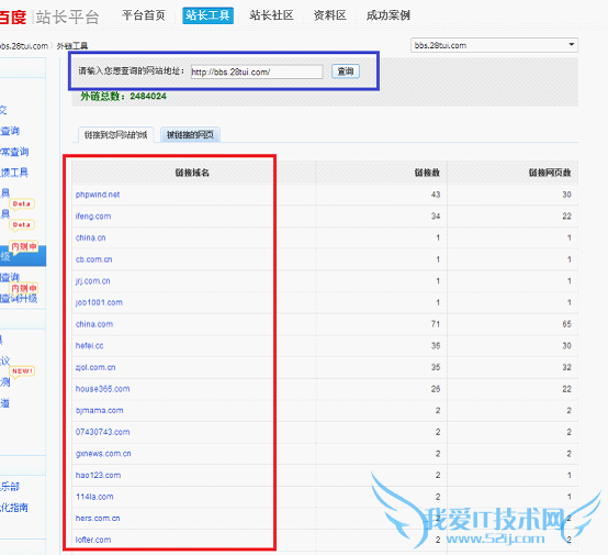见上图,新版最大的变化,在顶部我标注的蓝框内,多了个自助输入网址的查询功能,可以了解任何网站的外链情况。