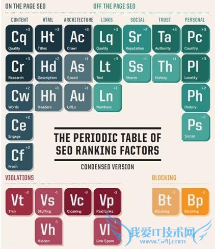 在每一个一级分类下边都有二级分类,每一个二级分类又包含更多具体的seo因素。你可以在每个小图中看到两个首字母缩略词,它们代表不同的元素。第一个字母代表一级分类,第二个字母代表具体的因素。