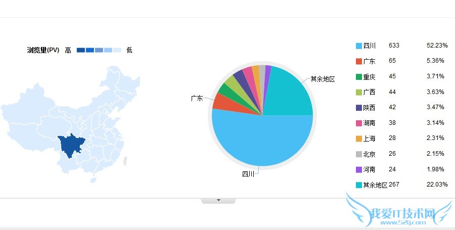 访客地域分布可以从IP中看出访客是在哪里访问的,这对于旅游行业来说很重要,因为旅游产品一般都是“从XXX到XXX旅游”,有很大的地域限制。聚途旅游网的访客中,有超过52.23%是从四川来的,其次是广东地区。我们目前的意向性用户是“四川范围内”和“广东地区”,所以相对比较匹配。
