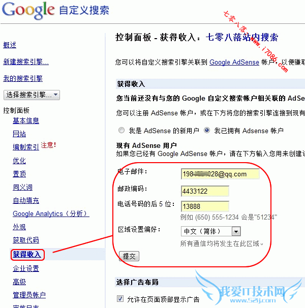 3、选择“获得收入”标签。这里是与 Google AdSense 帐户进行绑定的页面,即在你的搜索页面添加Google AdSense 广告。按要求填写您注册 Google AdSense 时的电子邮件、邮政编码、注册时电话号码的后 5 位数,区域设置偏好选择中文。提交!!