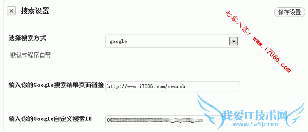 2、如果主题控制面板中有搜索控制选项,则到主题控制面板中填写搜索引擎的唯一ID和Google搜索结果页面链接,设置完成后即完成了Google自定义搜索与WordPress完美给合。例如我的是http://www.***.com/search