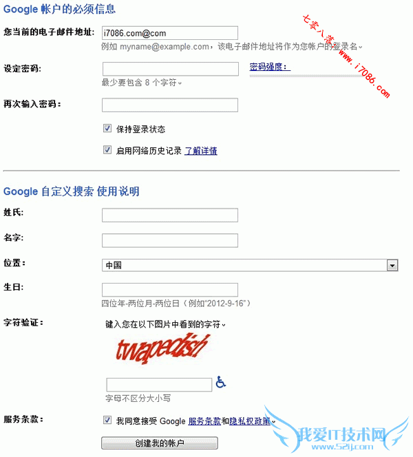 2、填写必要的账户注册信息,并同意接受Google服务条款和隐私权政策后,创建您的账户。