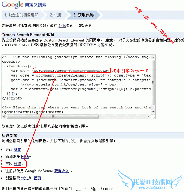 4、进入获取代码页面。提示“恭喜您!您已成功创建“**站内搜索”搜索引擎。”,请一定记录下搜索引擎的唯一ID。是否结束了NO,我们还需要进行“后续步骤”的设置,否则你无法使用。在这里我们先选择“外观”进行设置。