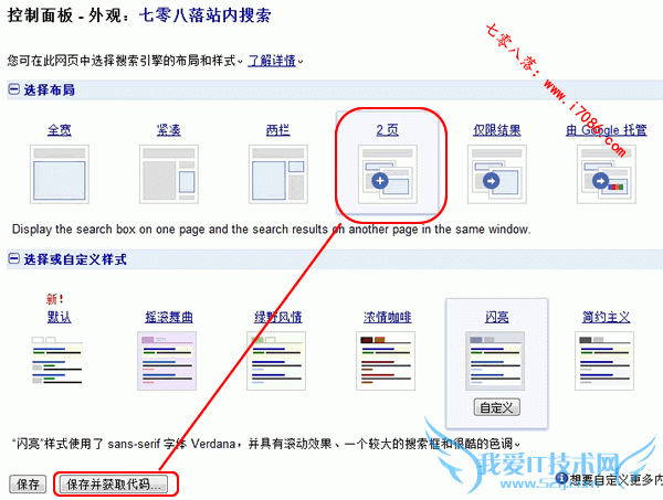 1、选择“外观”后,实际上我们进入了Google自定义搜索的控制面板。控制面板-外观→选择布局。这里我们需要选择2页式布局,否则搜索结果无法再新页面打开。切记点击保存并获取代码,复制完整代码并记录下来。