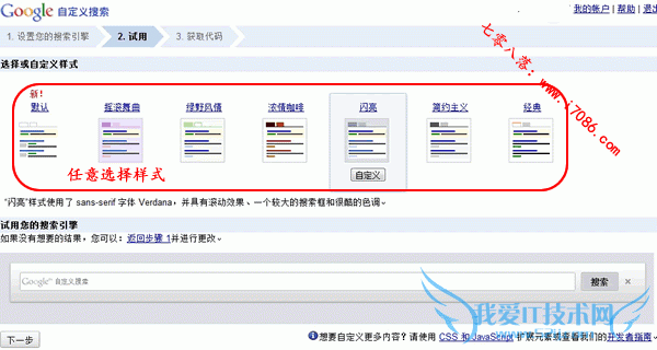3、选择或自定义样式。这里的每一款样式您都可以选择,选择后在“试用您的搜索引擎”中可以即时的显示效果。选择好后点击下一步。