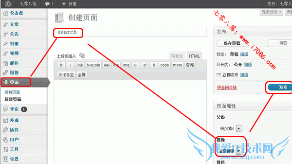1、请在您的主题文件中,找到search.php文件,复制我们记录下的完整代码到search.php文件中,并在主题后台新建search页面,使用搜索模版,并发布页面。