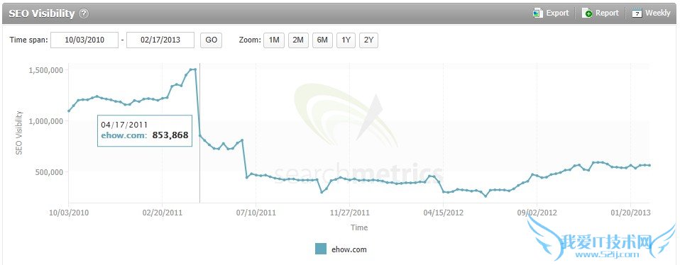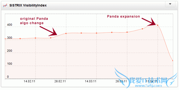 我们再来说一下Demand Media。熊猫算法发布之后,DM站群一夜之间为世人熟知,一家以内容农场的形式从Google获取巨大流量并以此上市,绝对是一个奇迹。而当时很多人也在讨论DM在熊猫的影响下受到的损失。然而让人惊讶的是,在2011年2月熊猫发布之初,DM的主力站点ehow反而受到了Google的亲睐,流量不将反升。不过好景不长,四月份Google发布了熊猫2.0,ehow随之沦陷。下面是当时SM及Sistrix发布的两张对比图表,基本情况类似: