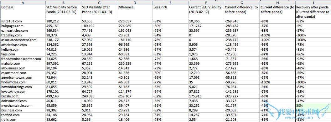 Searchmetrics(以下简称SM)及Sistrix两家搜索引擎服务公司都曾经针对熊猫算法做出了相应的网站数据分析,分别列出了一些受影响较大的网站。其中有很多都是中国站长熟悉的网站,如EzineArticles,HubPages,Squidoo等文章写作站。当然还有当时影响最为广泛的Demand Media站群,如ehow等。