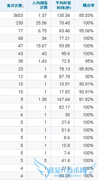 下面,我们在从网站的跳出率来进行分析,大家都知道通常网站的跳出率主要是针对我们的站点首页,网站的文章访问情况来进行判断的,通常一个网站的跳出率直接反映了该网站的用户体验是否良好,而对于该情况来讲,一个网站的文章内容又直接影响到该网站的转化率,从图片中我们可以看到小编的网站跳出率最低位81.82%,最高的为100%,从该数据中我们更加肯定很多游客在我的网站上没有找到想要的内容,从而离开,对于这点,小编觉得做的非常失败,网站跳出率太高了。