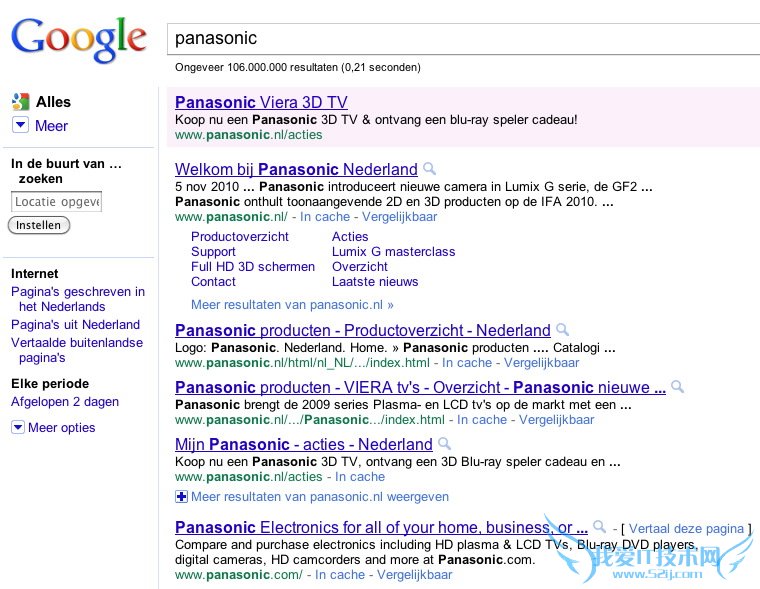 特定国家的搜索引擎,往往也会优先处理支持相应国家域名、及特定语言内容的网站。如下图所示,Google荷兰主页上的关于“松下”一词的搜索结果中,为首的是“Panasonic.nl”,而“panasonic.com”则被远远排在了后面。