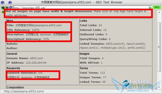 第四个提示,指出网页的关键词(Keywords)的相关性,我这个页面是0%。经过检查,最终发现关键词需要使用英文的逗号隔开,这样修改之后,关键词的相关性也是100%了。