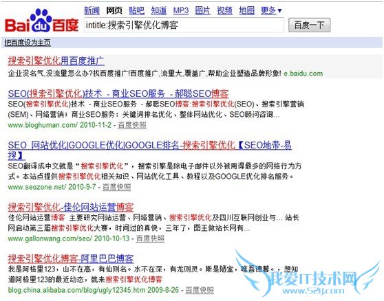 上图为未增加intitle指令的搜索引擎结果,大家很容易发现只要在description或keyword或者正文有此关键词都有可能被返回搜索结果,而运用了intitle之后如下图,很容易看到搜索结果必须是在网站的title中包含关键词才被返回。这条命令的最大价值在于对某个关键词更加深入的了解竞争对手(大家都说title很重要嘛)。