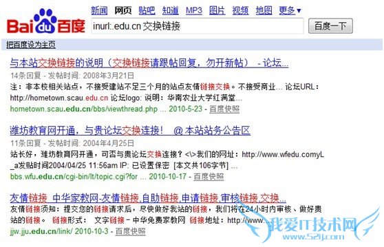 这条指令也是做SEO工作最常用的组合搜索,意为网址中含有edu.cn(这个不用说,教育类网站,权重高嘛)的内容中有“交换链接”字样的信息。这样的组合搜索可以帮助我们找到需要交换链接的站点,同时可以快速的寻找高价值的外部链接。