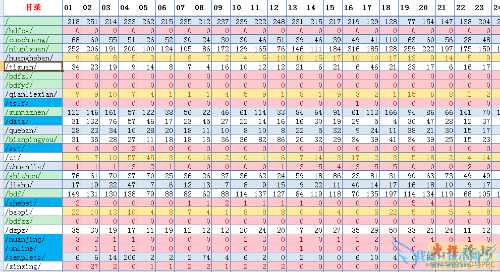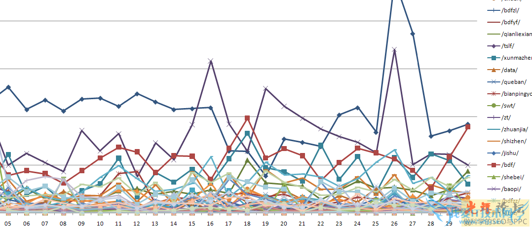 用MSSQL提取出爬虫抓取的目录,分析每日目录抓取量。可以很清晰的看到每个目录的抓取情况,另外可以对比之前的优化策略,优化是否合理,重点的栏目优化是不是预期的效果。如图,