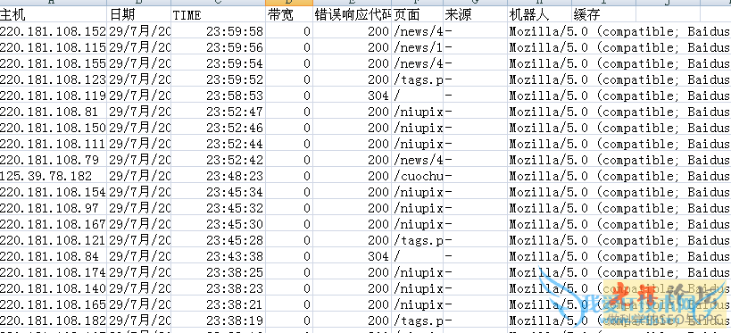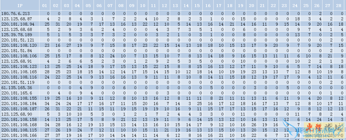 通过MSSQL提取日志中的爬虫的IP,通过excel进行统计,每日每个IP的抓取量,同样我们需要看整体,如果IP段没有明显的变化的话,网站升降权是没有多大问题的。因为在网站升权或者降权的时候,爬虫的IP段会更换的。