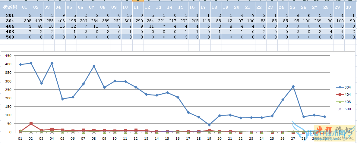 而以上这些数据,我们需要统计出一段时间的数据,看这个时间的整体趋势是怎么样的,这样才能够发现问题,才能够调整网站的整体策略。下面就以一站点上个月的日志基础信息为例。