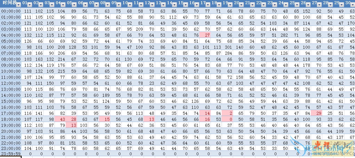 通过excel中的数组函数,提取每日的时间段的爬虫抓取量,重在分析每日的抓取情况,找到相应的抓取量较为密集的时间段,可以针对性的进行更新内容。同时,还可以看出,抓取不正常情况。