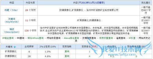 从上图可以看出,网站是做两个关键词即:矿用摄像仪和防爆摄像仪。在网站优化初期,我们将网站的标题定义为“矿用摄像仪,防爆摄像仪 - 徐州中矿润泰矿业科技有限公司“,网站于9月22日开始做seo优化,大概半个月左右的时间,"矿用摄像仪"排在首页,"防爆摄像仪"排在第八页,在未来的两周,我们依然有频率的增加网站文章以及站外推广,排名变化很小,一直维持在第七第八页。