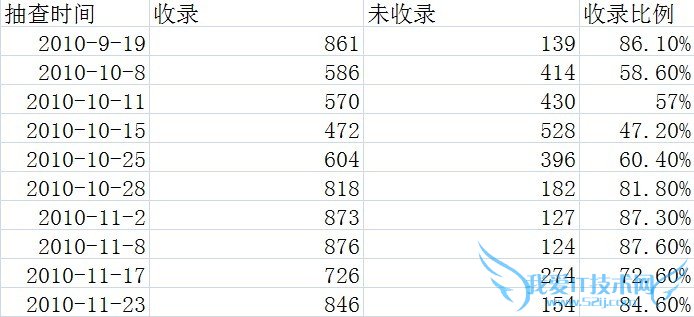 可以看到,2010年10月11日左右的收录值急剧下降,最低时平均千条帖子的收录不到50%