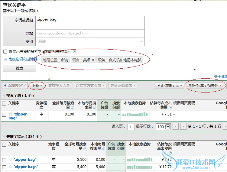 图中所示,1是要选择正确的语言和地域,很简单。2是这边的按照相关性排序。3.在关键词上选择本页,然后下载前100个。