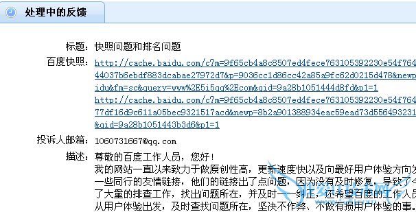 小站在刚刚出现排名和快照波动的时候,因为担心友情链接被站长朋友给撤了,以起更大排名波动,便向百度投诉中心投诉,如图: