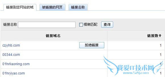 当然,如果你不清楚哪些网站上有你的链接,你可以先用外链分析工具查询一下,获得拒绝链接的站长可以看到在链接到你的网站的域后面会出现“拒绝链接”按钮: