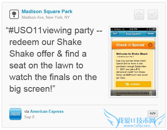 现在,你把你的Foursquare和你的美国运通公司信用卡联系起来后,当你在加盟地点刷卡的时候,就会自动签到。根据不同的地点,一部分钱将会自动反给你的信用卡,或者你将有资格享受一些促销活动。