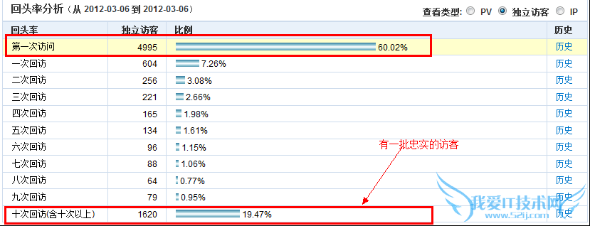 站点是否有价值也可以从用户的回头率情况看得出来,毕竟一个有价值的内容,用户会经常的来访问站点,查看自己所需要的东西。从上图可以看出,每天都会有新的访客来到该站点,而也有一批老访客时常来。从这点可以看出这个站点的黏度很不错,很好的黏住了用户,吸引用户来访。假使能把十次回访的比例提高,也体现出了网站正在往正确的方向前行。