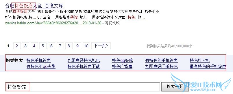 ,这是我在百度上搜索特色餐馆的结果,我的网站标题并没有出现特色餐馆这个关键词,我的网站排在第二页了。大家看看红色框里的虽然我的标题是特色餐厅,但同样被标红了,说明在搜索引擎眼里,这两个词是一样的。