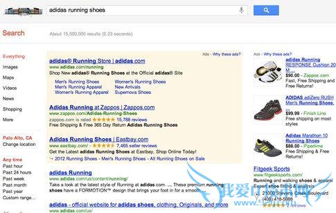 在元标题(meta title)和元描述(meta description)的页面使用有针对性的关键字,因为大多数搜索引擎倾向于突出与用户搜索查询匹配的标题/描述关键词。所以,如果我搜索“阿迪达斯跑鞋”,任何自然结果或推广结果都会用加粗(译注:中文搜索引擎会飘红)显示匹配关键字,如下图所示。这些突出显示的关键字很容易吸引眼球,增加用户点击你的搜索结果的机会,进而增加用户进入你的网站的转化率。在元数据中使用这些关键字,也提高了你的网站排名上升的机会,这本身就是转化的优化。