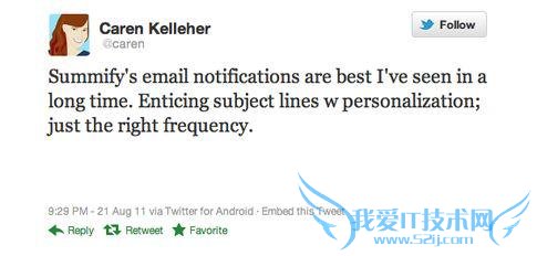 其他优化方法包括使用社交信息。例如,Summify以卓越的精选邮件著称。他们整合你所有的社交网站的头条故事(LinkedIn + Twitter + Facebook),做成每日精选邮件发送给你。在标题行里,他们列出了你的社交联系人的名字来提高打开率。标题可以是“下列是来自John Smith, Sally Jones, 和Rob Johnson的热门动态”(这些人可能是我在Facebook/Twitter/LinkedIn上的朋友或联系人)。值得一提的是,用户对这种体验表示认可,因为个人化的信息让用户感知到邮件和自己有关系:
