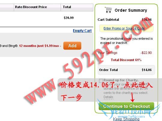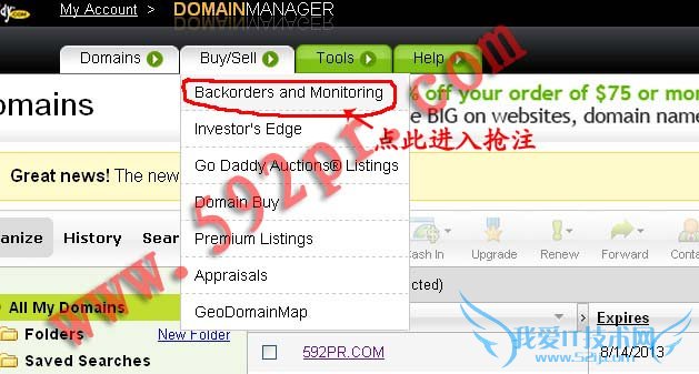 接下来就是比较实惠godaddy.com,一个抢注资格售价20.99美元,可使用支付宝付款,如果抢注某个域名失败,可以继续抢注其他域名,直至成功为止。使用我们提供的优惠码可以节省33%,这样就只需要14.06美元了。下面详细介绍抢注步骤:
