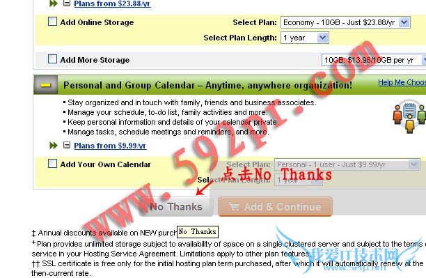 二:接下来有两个页面都是Godaddy向你推销的另外的产品,我们只是要抢注域名,所以你只要点两次“No Thanks”就OK了。如下图: