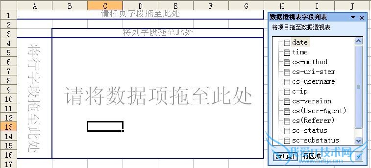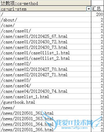 7、 你不仅可以分析每一天的蜘蛛访问频率,也可以分析蜘蛛抓取了你网站的哪些页面,方法很简单,将“数据透视表”中“行字段”的“date”换成“cs-uri-stem”,重新刷新数据透视表即可。