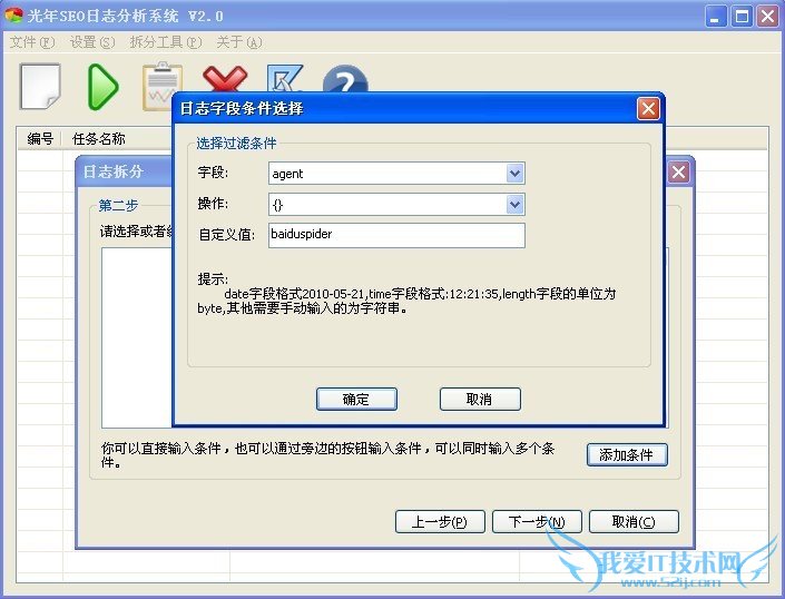 2、 点击下一步后,添加拆分条件,选择到agent,在自定义值处填入baiduspider(这里是分析百度蜘蛛,也可以填入googlebot来分析谷歌蜘蛛),然后再下一步……直到保存,最后会生成两个.log文件,不带_exclude的是我们需要的,带_exclude的则是拆分后剩下的。