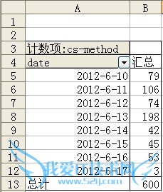 6、 我们可以尝试将“数据透视表字段列表”中的“date”拖入“行字段”中,然后将“cs-method”拖入“数据字段”中,大家看到了什么?如图所示,从6月10日到17日,每一天百度蜘蛛访问的次数就显而易见了,蜘蛛的访问频率一定是和我们的操作有关的,回忆一下,在蜘蛛访问频率高的前一天你都做了些什么,多做这样的总结,你就能得出规律了。