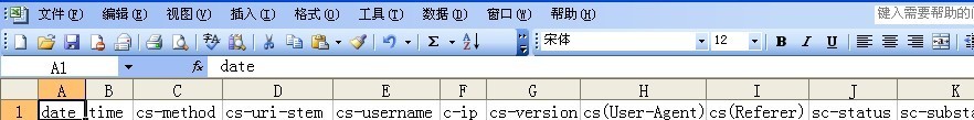3、 打开我们需要的log文件,然后从第四行的date开始直到结束,整体复制到excel中A列中,然后利用excel的分列功能,“数据”-“分列”-“分隔符号”-勾选“空格”-“完成”,最终得到我们需要的表格化的数据(表头如下图)。