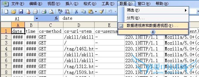 4、 前3步是网站日志数据表格的制作过程,接下来就需要用到excel中强大的“数据透视表”功能进行数据分析的工作,我这里用的是excel2003版,用07版的同学可以在数据那一项找到。