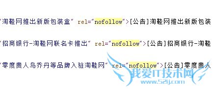 在上图拍鞋网的源代码中我们可以看出其对公告信息、广告信息或者底部的不重要信息都进行加上nofollow标签的处理。而这么做有什么不同呢?其实你只要仔细的研究该网站的结构,你会发现所有的页面,除了商品描述页面和目录页面的其他页面全部基本上都使用了nofollow标签,这就可以很好的将权重引导到想要获得排名的产品页面和栏目页面,而其他不重要的公告、广告等则可以不让其传递权重,因为这些页面并没有排名的意义。记得光年论坛的国平老师曾说过,蜘蛛停留时间是有限的,如何让蜘蛛更有效率的爬行对于站点来说是十分重要的。对此借由nofollow标签让蜘蛛更有效率的爬行是关键的优化手段。