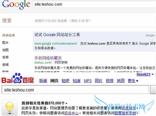 SITE一下leshou.com。百度收录近88万条、Google收录近22万条,